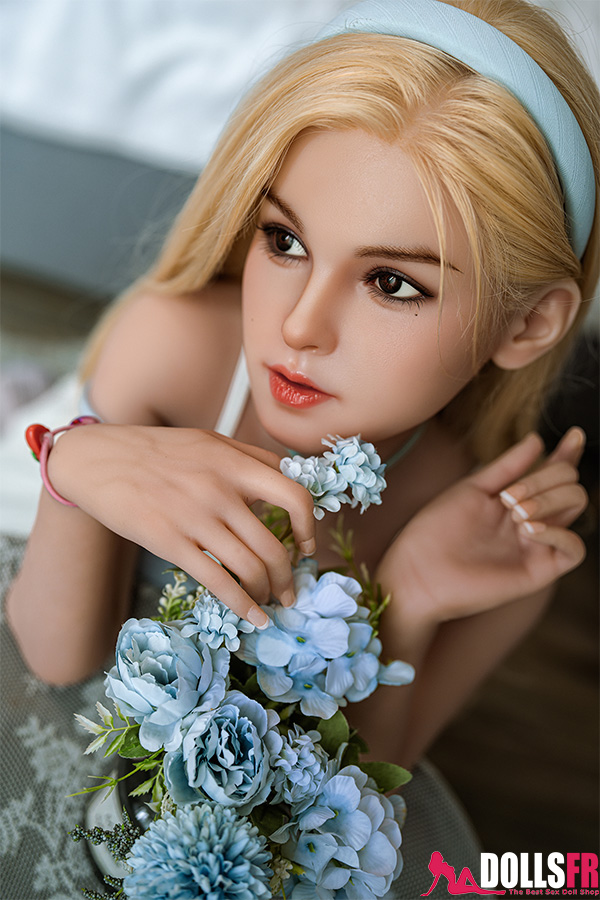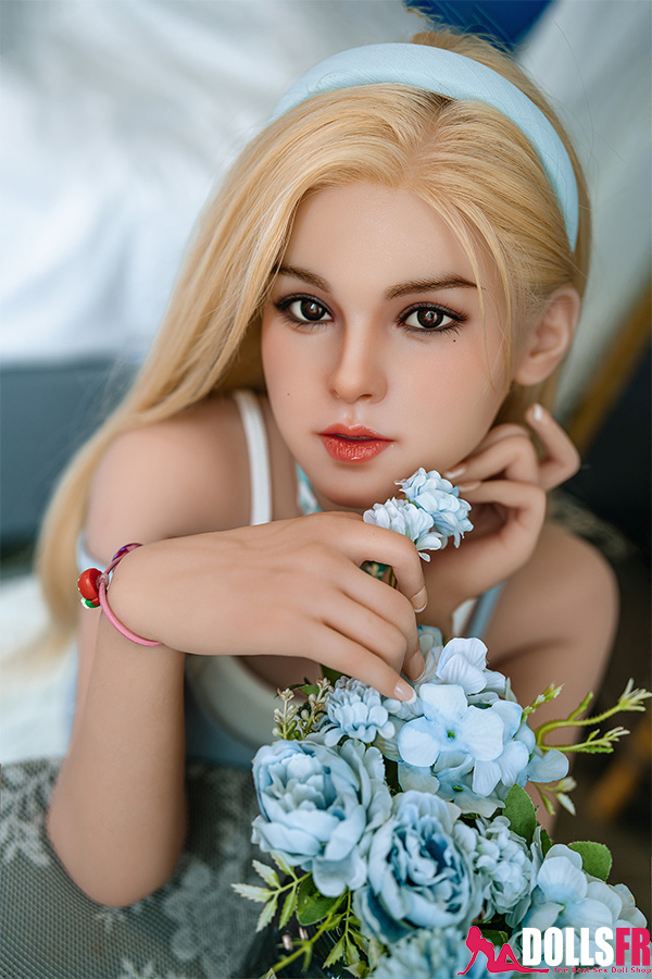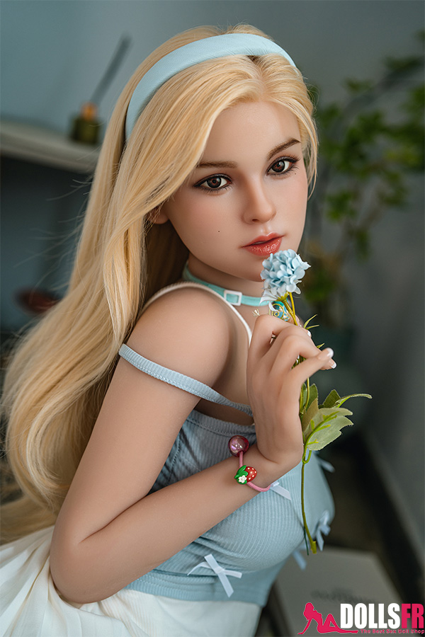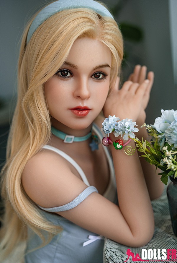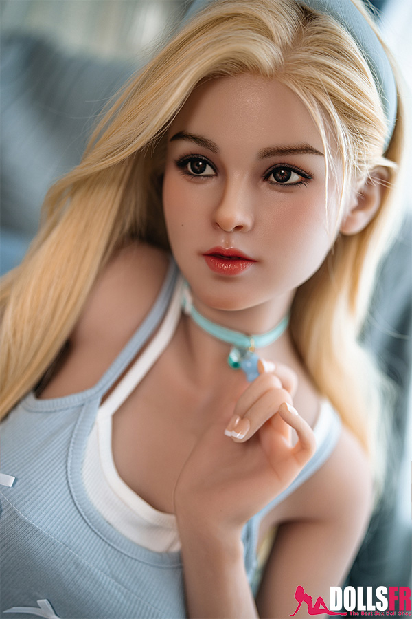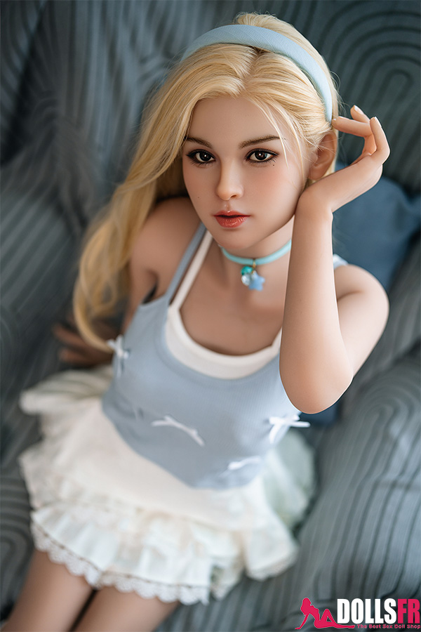 Ses longs cheveux blonds captent la lumière avec une brillance subtile, maintenue par un serre-tête bleu clair qui s’accorde parfaitement avec le collier et le pendentif assortis autour de son cou, ajoutant une touche douce et espiègle. Cette european real doll porte un haut bleu à fines bretelles qui met en valeur l’éclat laiteux de sa peau, accompagné de bas mi-cuisses en dentelle blanche qui soulignent avec délicatesse ses courbes. La tête en silicone, au maquillage soigné, et le corps en TPE souple et réaliste offrent une séduction à la fois tactile et visuelle, jusque dans les moindres détails.