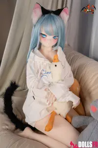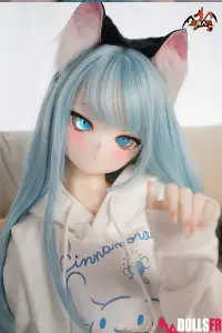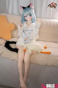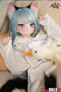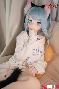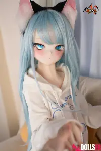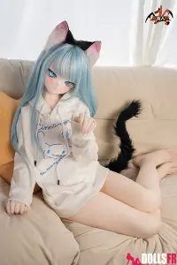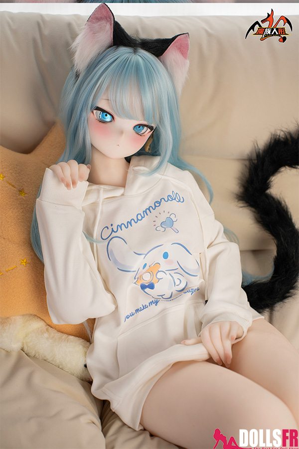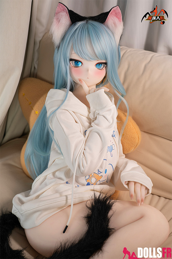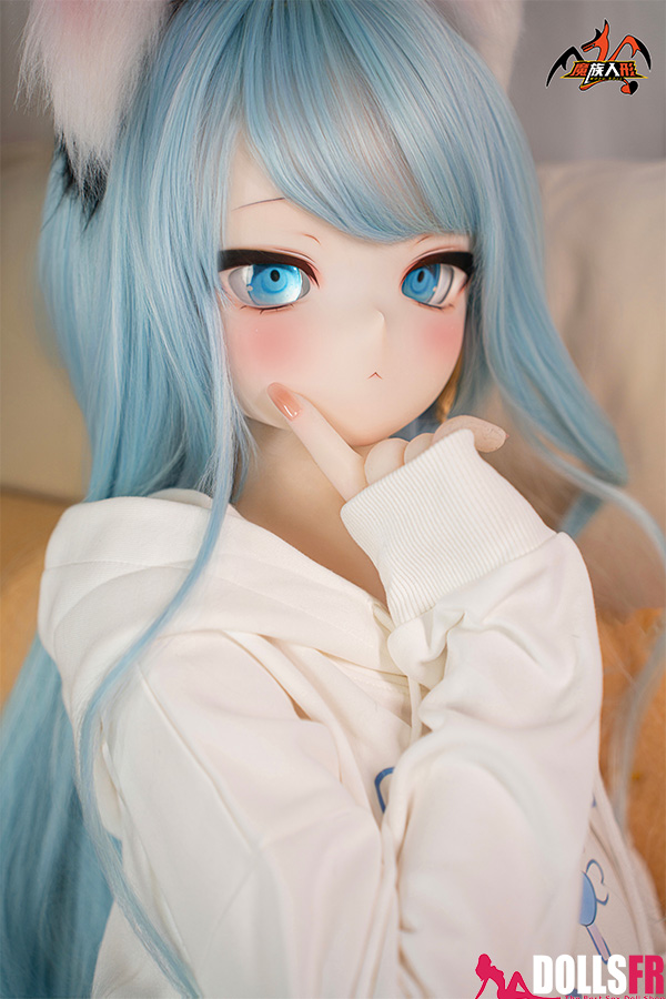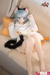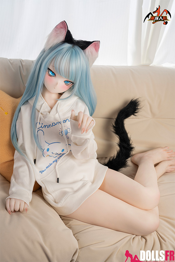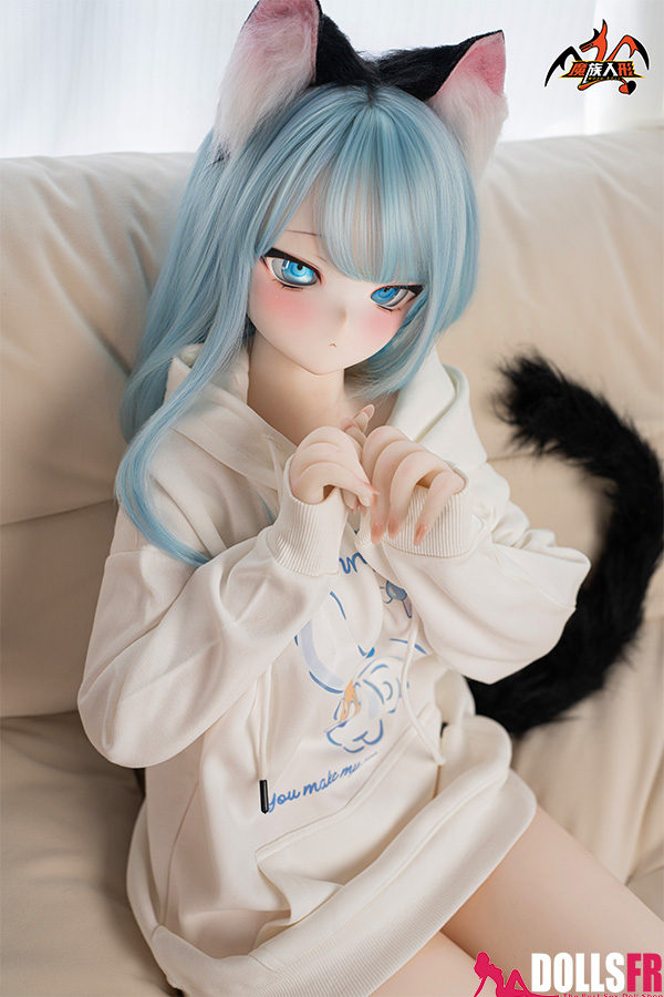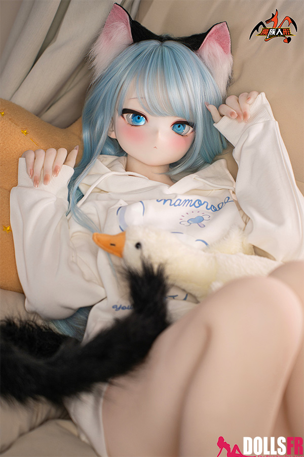 141 cm de pur kawaii félin : oreilles noires dressées sur la tête, queue noire qui pendouille derrière, et cette pose trop mignonne avec les poings serrés de chaque côté du visage comme si elle miaulait un petit coucou timide. Les cheveux bleu clair tombent en mèches légères autour d’un visage rond aux grands yeux bleus immenses qui te fixent avec une innocence totale. Le haut simple et la jupe courte laissent voir une silhouette fine et délicate – taille marquée, hanches juste assez rondes, et une petite poitrine qui colle parfaitement au style ado chaton. La tête PVC garde les traits nets et expressifs (surtout les yeux qui brillent vraiment), et le corps TPE est hyper doux au toucher – chauffe vite, colle un peu aux doigts, et reste souple partout pour la câliner dans n’importe quelle position. Elle est légère, facile à déplacer et à ranger, et surtout le prix reste doux pour une catgirl aussi bien faite. Si tu craques sur les petites asiatiques au look animalier innocent avec queue et oreilles, elle va te faire fondre en deux secondes : un petit chaton bleu qui attend juste que tu la grattes derrière les oreilles… et que tu la prennes contre toi pour ronronner toute la nuit. Une mini catgirl prête à te faire craquer avec son air trop mignon.