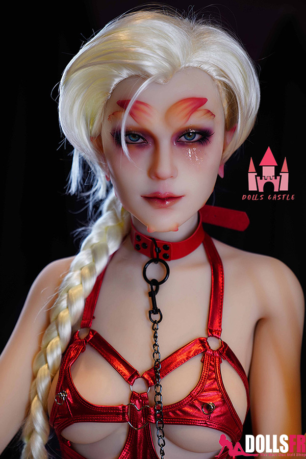 Cette poupée sexuelle grande taille mesure 170 cm et arbore de longs cheveux blonds soigneusement tressés en une élégante natte. Son visage présente un maquillage intrigant et original : des sourcils orange flamboyant au tracé peu humain, et une mâchoire ornée de petites excroissances orangées qui évoquent une transformation animale. Sa peau blanche et lisse contraste avec la lingerie érotique rouge qui l’enserre, tandis qu’une chaîne métallique autour de son cou ajoute une touche de provocation. Chaque détail, des cordons délicatement noués aux petites marques faciales, a été conçu pour créer une love doll à l’apparence à la fois énigmatique et captivante, qui attire le regard et stimule l’imagination.