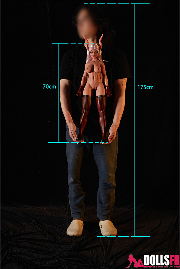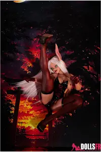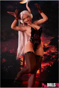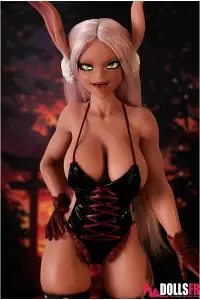 Sous le body noir à fines bretelles, sa peau sombre contraste intensément avec sa longue chevelure blanche, créant une aura mystérieuse et envoûtante. Ses yeux verts brillent d’un éclat exotique, tandis que ses longues oreilles rappelant celles d’un mouton ajoutent une touche de charme non humain. Sa silhouette menue, à peine 70 cm, est sublimée par des gants rouges et de longues bottes assorties, révélant une audace sensuelle. Cette hentai sexdoll incarne un idéal fascinant pour ceux qui recherchent l’originalité et l’esthétique fantastique.