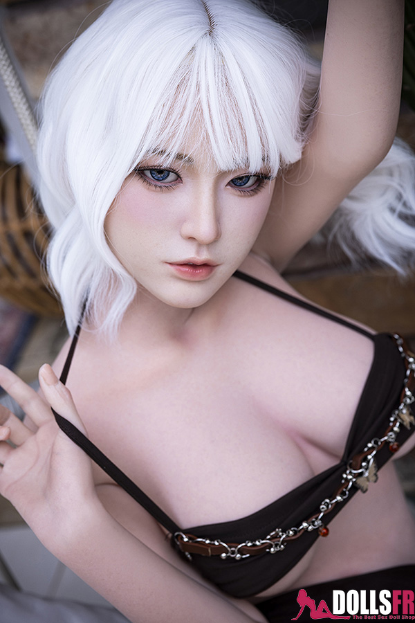 Dans un jardin intérieur baigné de lumière, entouré de nombreuses plantes vertes et d'une piscine scintillante, elle est assise confortablement sur une chaise en osier, dégageant une atmosphère détendue et élégante. Sa chevelure courte et blanche encadre son visage aux yeux bleus pétillants, et son corps est sublimé par une lingerie noire ornée d'un pendentif doré sur la poitrine. La hybrid sex doll, aux formes généreuses et à la peau blanche comme de la porcelaine, combine un réalisme frappant et un toucher en silicone doux et agréable. Chaque détail de son apparence respire la sophistication et la sensualité, offrant une expérience visuelle captivante dans ce cadre paisible.