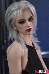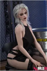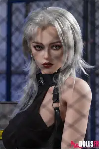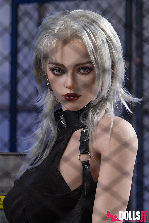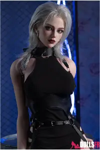 Ses longs cheveux argentés en coupe queue-de-loup ondulent avec élégance, renforçant son aura froide et envoûtante. La blonde sexdoll porte un haut noir sans manches, tandis qu’une chaîne métallique autour de son cou brille d’un éclat glacé, évoquant une tentation interdite. Son maquillage charbonneux accentue les traits de son visage, et ses lèvres rouges ainsi que son regard profond dégagent une séduction irrésistible. Les bas noirs épousent parfaitement ses longues jambes, et la lingerie en dentelle noire se devine subtilement, révélant une sensualité raffinée. L’ensemble compose une silhouette de reine nocturne, froide et dominatrice, qui captive et enchaîne tous les regards.