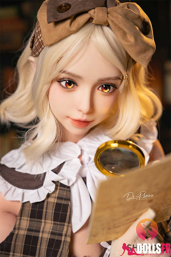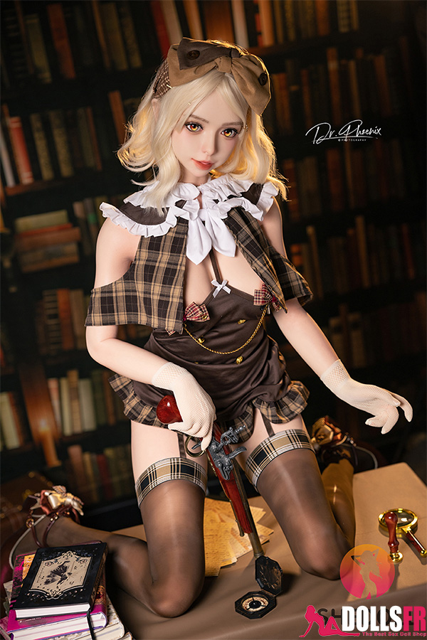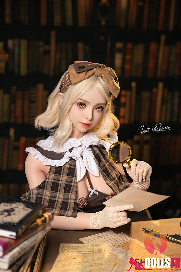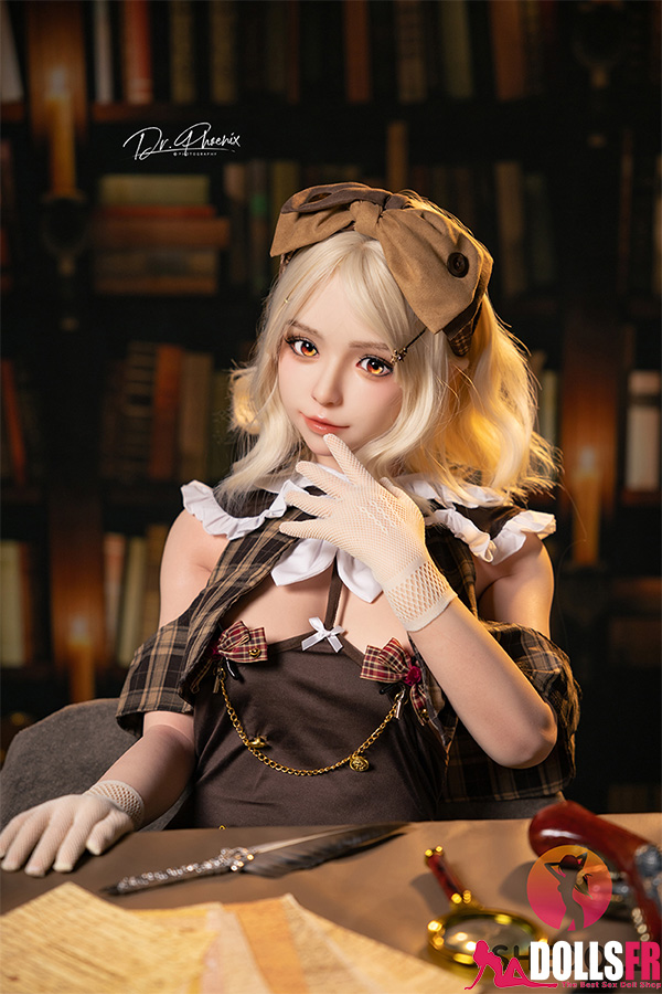 Dans un bureau au style rétro, une jeune fille se tient en silence. Une loupe, un fusil à levier, une plume d’écriture et des piles de livres anciens témoignent de sa véritable identité : celle d’une détective. Ses yeux dorés, perçants et envoûtants, illuminent un visage d’une grande délicatesse. Un large nœud brun orne ses cheveux courts et blonds, tandis que cette poupée sexuelle porte une robe courte marron foncé associée à des bas noirs élégants. Une légère traction révèle ses seins en bonnet E et expose ses cuisses charnues. Séduis cette petite détective… et emmène-la chez toi.