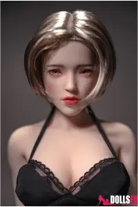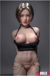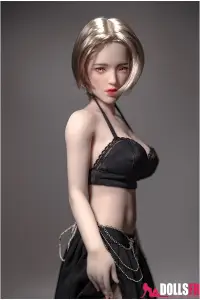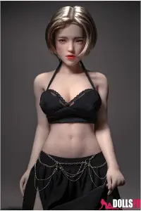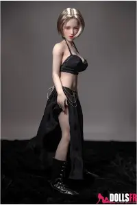 Sous la lumière douce, ses cheveux courts argentés reflètent un éclat subtil, presque métallique, qui accentue son allure moderne et raffinée. Le bustier noir épouse parfaitement sa silhouette fine, mettant en valeur la délicatesse de ses formes, tandis que la longue jupe noire fendue sur le côté laisse deviner des jambes fines et élégantes à chaque mouvement. Les bottes hautes apportent une touche de caractère, renforcée par une chaîne corporelle brillante qui souligne avec sensualité les courbes réalistes de cette poupée sexuelle.