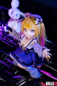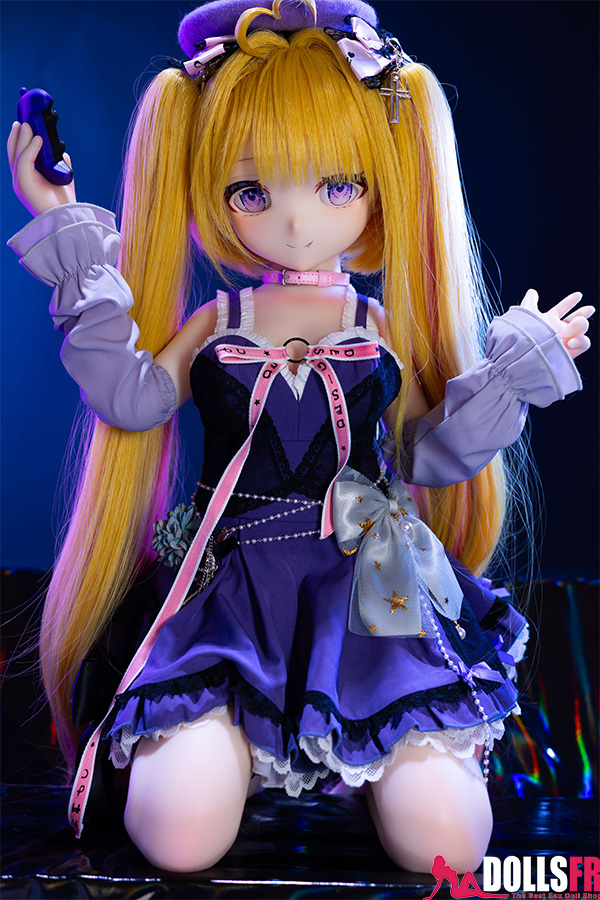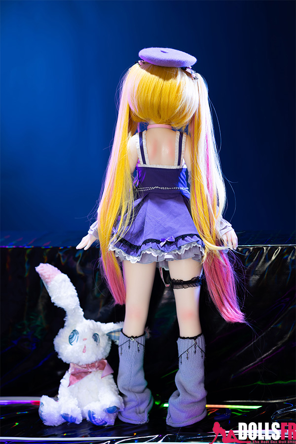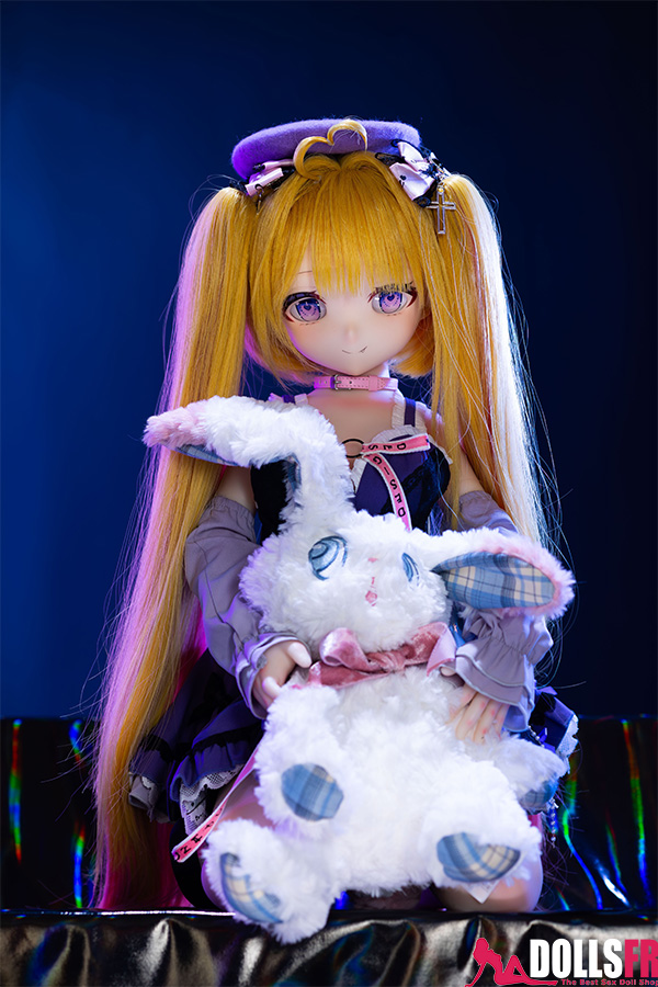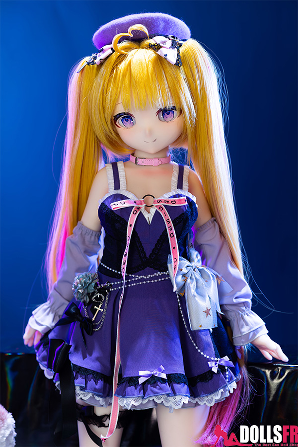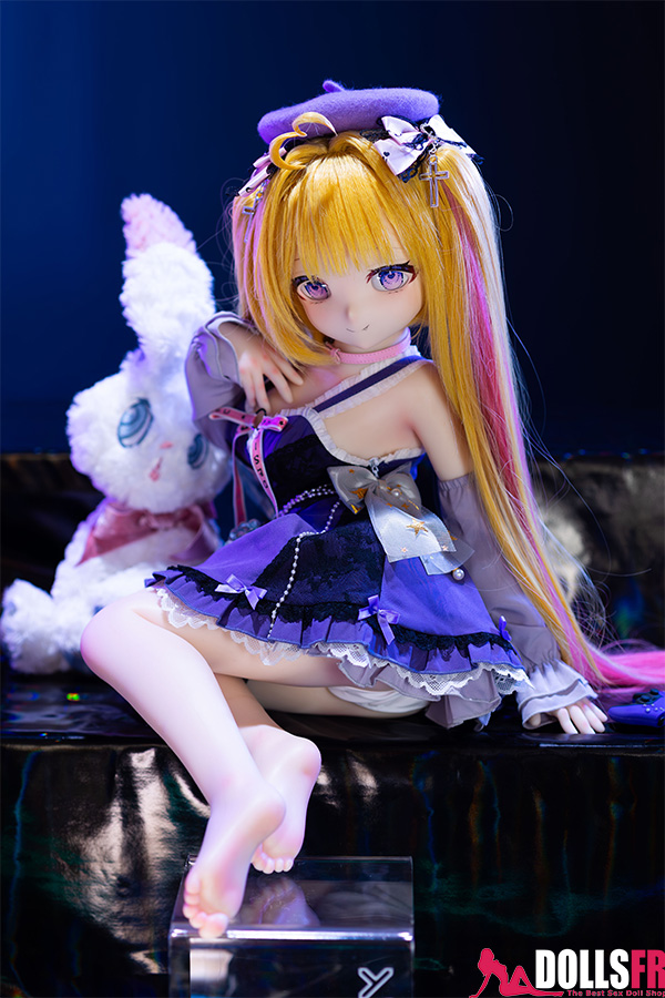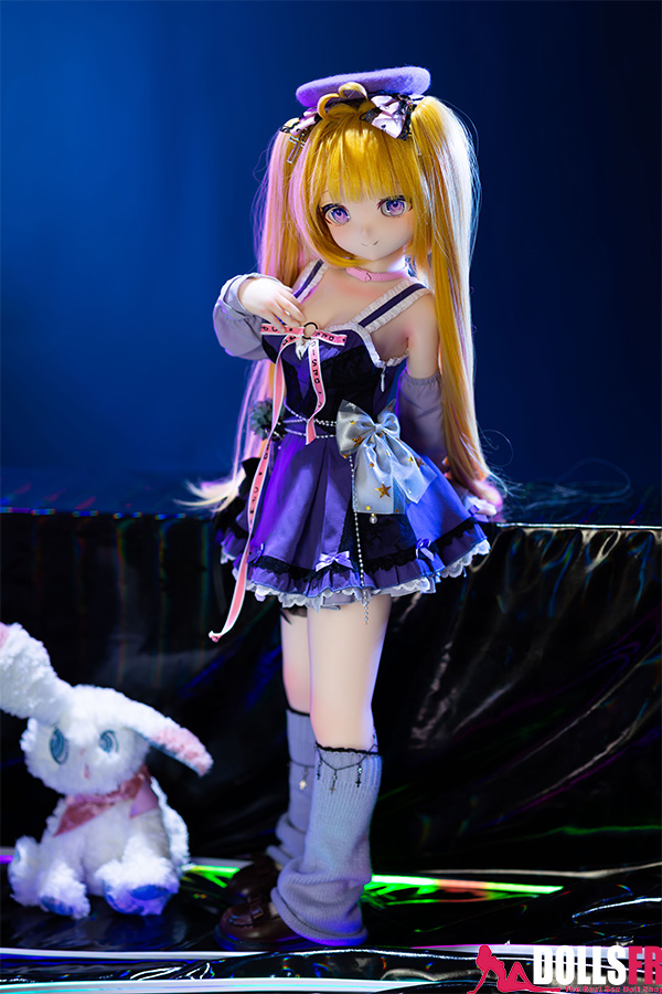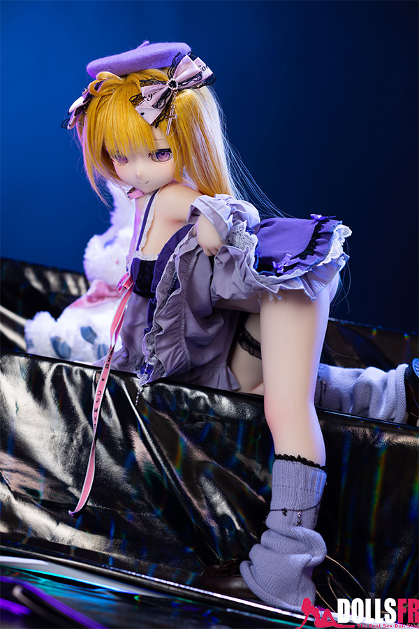 85 cm de pur kawaii gothique : béret violet posé de travers sur des couettes blond-rose qui tombent en mèches soyeuses, choker serré autour du cou et robe courte à volants qui couvre juste ce qu’il faut pour faire monter la température. Le corps est minuscule et léger – tu la soulèves d’une main sans forcer – avec une silhouette fine comme une brindille, petite poitrine discrète et hanches qui commencent à peine à s’arrondir. La peau est douce au toucher, chauffe vite contre toi et colle un peu aux doigts quand tu caresses. Elle a ce visage poupin avec de grands yeux innocents et un petit sourire timide qui te fait fondre direct. Elle se laisse poser partout : assise sur le bureau avec les jambes pendantes, penchée en avant pour montrer les volants de la robe, ou juste blottie contre toi pour un câlin prolongé. Si tu craques sur les mini sexdoll au style anime lolita goth avec ce mélange de mignonnerie et de sensualité subtile, elle va te rendre accro en deux secondes. Une petite blonde-rose gothique qui attend juste que tu la prennes dans les bras pour jouer à la princesse sombre.