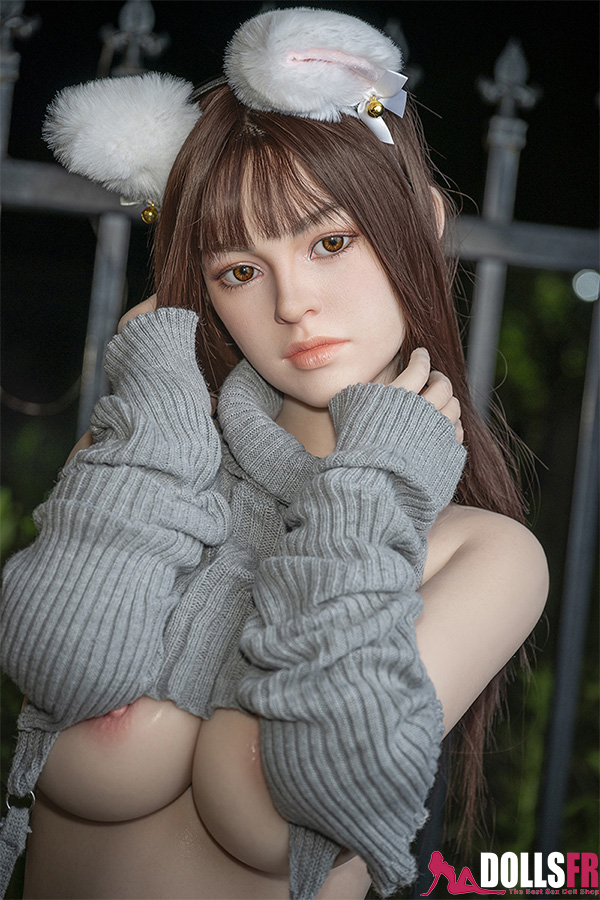 Ses longs cheveux noirs tombent lisses et brillants, encadrant un visage délicat et expressif. Le bandeau à oreilles de chat ajoute une touche espiègle et coquine à son apparence. Elle porte un ensemble audacieux en maille grise — bustier et manches assorties — qui met en valeur sa poitrine généreuse et ses formes séduisantes. Sa tête en silicone réaliste et son corps en TPE souple garantissent une sensation tactile très proche de la réalité. Installée au milieu d’un jardin luxuriant, entourée de verdure et de fleurs éclatantes, cette sex doll évoque à la fois douc
